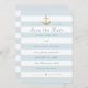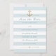 Customisez cette élégante et moderne Elégante Nautique Mariage Rappel Enregistrer La Date Flat Card Invitation. Design rayé bleu clair et blanc, conçu comme un modèle pour une personnalisation facile. La couleur bleu pastel des bandes est personnalisable et peut être changée en n'importe quelle autre couleur, vous pouvez la changer en changeant la couleur Arrière - plan. Veuillez noter que l'or sur ce design, sur l'ancre d'or, n'est pas une véritable feuille d'or, c'est une impression couleur. La couleur du texte est personnalisable, les éléments dorés peuvent être déplacés ou supprimés. Vous pouvez également modifier le style d'angle.