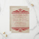 Élégant et chic Elegant Deco Enregistrer la Date Annonce avec une paire de bordures d'art déco tourbillonnante fleurissent en rouge foncé et un look vintage texturé arrière - plan dans un beige doux. Cela sauve l'invitation date a le charme rustique tout en maintenant une agréable atmosphère sophistiquée. Parfait pour un mariage à thème vintage art déco des années 1920. Facile à customiser, il suffit d'ajouter les détails de votre mariage dans les champs de texte fournis. Cliquez sur "Customiser" pour trouver d'autres options de personnalisation comme changer de polices ou de couleurs de texte.
