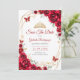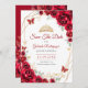 Red, gold and white Quinceanera celebration save the date card. Features, script font, gold butterflies, watercolor roses and tiara. Perfect for an elegant princess style glam celebration. Personalize with your own details. Printed Zazzle cards or instant download digital printable template.