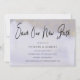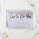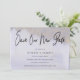 Un lavement à l'aquarelle bleu/violet doux couvre les deux côtés de cette élégante carte Save Our New Date. La parties scintillant d'or orne le dessus à l'avant et le bas à l'arrière. Sur le devant, Save Our New Date est écrit dans une grande police de caractères de script moderne, puis vos nouveaux détails de mariage suivent dans un élégant texte serif. Votre photo préférée est au dos. Vous trouverez ci-dessous vos nom, date et emplacement du mariage.
