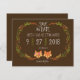 Cette charmante collection de faire-part de mariage présente un couple de renards élégamment habillés entourés d'une guirlande de feuilles dessinées à la main dans un arrangement de couronne rustique.