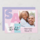 Des teintes pastel douces se combinent pour une carte "Enregistrer la date" moderne et romantique printanière. Le devant de la carte présente la photo du couple entourée d'un cadre blanc. Le texte "la date" est posé sur "ENREGISTRER" en texte script noir. Le dos de la carte est un fond blanc cassé, uni et clair violet.