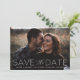 Une carte de datation moderne affichant votre photo fiançailles préférée avec "Save the Date" dans une simple superposition de police blanche complétée par un élégant script de calligraphie. Personnalisez l'avant de la photo enregistrez la carte de date en ajoutant vos noms, la date du mariage et l'emplacement du mariage. La carte revient à un arrière - plan gris avec un motif moderne blanc. Changez la couleur de l'arrière - plan en une couleur de votre choix grâce à nos outils d'édition.