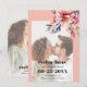 This elegant Save the Date announcement for a wedding showcases a beautiful photo of the couple surrounded by a rhododendron branch with peach-pink flowers in the top right corner. The peach borders add a touch of sophistication to the entire layout, perfectly complementing the modern and stylish look achieved by the bold typography of the text. Flipping to the back reveals yet another lovely photo of the couple, adding a personal touch to the announcement.