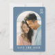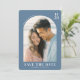 This wedding save the date card features a modern, romantic design with an arched top border framing a central photo placeholder. The deep blue background contrasts beautifully with soft pastel hues in the image, creating a warm and inviting atmosphere. Elegant typography combines serif and sans-serif fonts for a sophisticated yet contemporary look, while customizable placeholders allow for personalization. Perfect for setting the tone for a beach-themed celebration, this card exudes a sense of intimacy and anticipation.