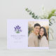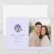 This wedding save the date features a split layout with an elegant lavender illustration on the left and a warm, candid photo of a couple on the right. The design combines soft purples and greens from the floral illustration with golden hues from the photograph, creating a romantic and serene mood. Classic serif fonts add a touch of formality to the customizable text, which includes names, dates, and location placeholders. Perfect for couples looking to blend personal warmth with timeless elegance, this design captures the joy and anticipation of their upcoming wedding in Naples, Florida.