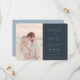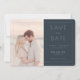This wedding save the date features a split layout with a romantic beach photograph on one side and elegant navy background on the other. The design combines soft, natural lighting from the photo with clean serif and sans-serif typography for a modern yet timeless look. Its minimalistic color palette of warm beige, light blue, and deep navy creates a serene and intimate mood, perfect for announcing your special day. The clear hierarchy and ample negative space ensure readability while maintaining an inviting and sophisticated aesthetic.