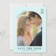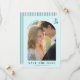 This wedding save the date card features a romantic and elegant design with an arched top border framing a golden-hour photograph of two smiling individuals. The light teal background creates a serene atmosphere, complemented by dark teal text in a mix of serif fonts that add a touch of formality. Customizable elements allow for personalization with names and dates, while the phrase "SAVE THE DATE" prominently displayed in bold black letters ensures clarity. Perfect for announcing your special day, this card exudes warmth and anticipation, making it ideal for couples celebrating their upcoming wedding.