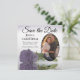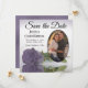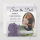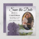 Ces magnifiques cartes de dates sont le moyen parfait pour que vos amis et votre famille connaissent votre prochain mariage. Elles présentent un design élégant avec un seul rose à long tige poussiéreux pourpre ou lavande réfléchissant dans un bassin d'eau avec des vagues et ondulant avec votre photo dans un cadre ovale. La légende indique Enregistrer la date avec de l'espace pour vos noms, la date et l'emplacement. Le dos est marbré violet gris.