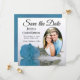 Ces belles fleurs modernes sauvent les cartes datées sont la façon parfaite de faire connaître à vos amis et votre famille votre prochain mariage. Elles présentent un design élégant avec un unique rose bleu ciel, turquoise ou azur à longue tige réfléchissant dans un bassin d'eau avec vagues et ondulant avec votre photo dans un cadre ovale sur un arrière - plan blanc classique. La légende indique Enregistrer la date avec de l'espace pour vos noms, la date et l'emplacement. Le dos est marbré bleu clair.