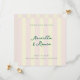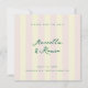 Envoyez des cartes de save the date modernes et dans l'air du temps avec des vibrations de l'Italie côtière et des rayures verticales de style cabane jaune beurre et rose coquillage pâle. Ce texte vert foncé élégant et chic est facile à personnaliser avec les détails de base du futur mariage comme les noms des mariés, la date du mariage, le lieu et le site web du mariage, ainsi qu'une photo d'enfacement carrée simple. Cela mélange une typographie sans serif moderne avec un script de style manuscrit pour une ambiance élevée mais toujours décontractée, tandis que la forme carrée donne une sensation unique et haut de gamme.