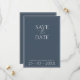 Mini Royal Blue Opulence Script Typographie Mariage Mariage Enregistrer la carte de date. Impressionnez vos invités mariages avec cette carte de mariage bleu royal à la mode et à la carte de sauvegarde avec un magnifique script blanc sur un arrière - plan bleu royal. Cette carte mariage de veille a un design bleu étonnant, avec des vibes modernes et minimes, parfait pour votre mariage simple, tendance et minimaliste. La disposition minimaliste et moderne attire l'attention sur le script blanc, en contraste avec l'arrière - plan bleu royal. Cette carte de mariage à l'état neuf donne le ton d'un beau cadre mariage entouré de fleurs neutres et d'un décor mariage. Un complément parfait à toute célébration hivernale ou traditionnelle.