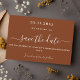 Un moderne et élégant Save the Date pour un mariage. Rouille, arrière - plan orange brûlé. Personnalisez et ajoutez une date et des noms. Le texte : Save the Date est écrit avec un grand script de style à la main tendance.