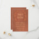 Ce mariage élégant, à l'exception des cartes datées, présente un design rustique et moderne avec des sprigs de feuilles couleur or couleur rouille orange sur une terre cuite ou arrière - plan couleur argile. La typographie comporte un bloc de texte alternant avec une calligraphie script sophistiquée. Simples et élégantes, ces cartes sont le moyen idéal de faire connaître à vos amis et à votre famille votre prochain mariage.