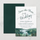 This wedding Save the Date card is designed for a destination wedding at Lake Tahoe. The design is rustic and outdoorsy yet elegant and beautiful. It features a watercolor landscape of the lake surrounded by pine trees and mountains. The back is a deep marbled forest green color. Perfect way to let your friends and family know about your upcoming wedding.