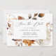 Elégant thème automne, sauver la date avec l'aquarelle fleurs d'automne et feuillage dans les nuances d'ivoire, crème, orange et marron. "Save the Date" s'affiche dans un script de calligraphie moderne avec vos noms et les détails mariages ci-dessous. La carte s'inverse pour afficher votre photo de fiançailles horizontal plein sang. La photo enregistre les coordonnées de la date avec notre collection Rustic Autumn Floral mariage.