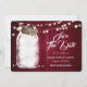 Mariage rustique bordeaux enregistrez la carte de date avec un pot de maçon et les coeurs de burlap contre un arrière - plan en bois de grange orné de lampes à cordes. Personnalisez facilement ce mariage romantique rustique bordeaux enregistrer la date en ligne. Objets correspondants disponibles pour compléter ce mariage bordeaux enregistrer la date.