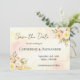 Annoncez votre journée spéciale en style avec cette élégante aquarelle florale enregistrer la carte de date. Doté de lavages pastel doux et de fleurs de pêche et de jaune, ce design romantique donne le ton parfait pour votre prochaine fête mariage. Cliquez sur "Personnaliser" pour afficher vos noms, votre date de mariage et votre emplacement. Idéal pour les mariages rustiques chic, de style champêtre ou botanique.