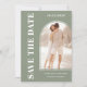 Cette carte moderne Save The Date dispose d'un modèle photo d'arc élégant et d'une typographie contemporaine sur un arrière - plan vert sage. Facilement personnalisable avec votre photo et vos détails.