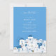 Une belle carte de dattes design avec illustration rustique de Santorin, églises à coupole bleue, Bougainvillea, plantes en terre cuite avec fond de mur blanc de l'île grecque. Destination élégante Santorin, design de mariage grec parfait pour Santorin et les mariages de style méditerranéen de l'île grecque. Le verso de la carte présente un monogramme minimaliste avec une église à dôme bleu. Des invitations de mariage et d'autres articles de papeterie sont également disponibles.