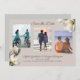 Cartes de mise en réserve avec fleurs de magnolia et trois modèles de photo. Des fleurs blanches de magnolia du sud ornent les coins de cartes plates de couleur beige rosé horizontales. Les modèles de photo sont en escalier, celui de gauche étant un peu plus haut que celui du centre et celui de droite un peu plus bas. Les photos de n'importe quelle orientation fonctionneront si le sujet est au centre. "Réservez la date" en haut, avec les noms complets, la date et le lieu du mariage en bas. Les couleurs correspondent à la collection de papeterie du magnolia du sud.