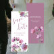 Carton d'annonce de mariage à motif floral aquarelle violet conçu avec des fleurs violettes vives sur fond blanc. Le texte du recto comprend : Save the Date, les prénoms de la mariée et du marié et la date du mariage. Le texte au verso comprend : le lieu du mariage et une invitation officielle à suivre, sur fond violet. Pour personnaliser, il suffit d'insérer vos informations dans notre modèle facile à utiliser, en remplaçant le texte d'exemple. Disponible en version imprimée ou téléchargement numérique.