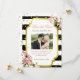 Un avis de sauvegarde de la date très joli rayé noir et blanc, avec des confettis dorés, des roses roses et du souffle de bébé.