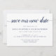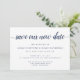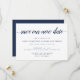 Des cartes élégantes et simples pour annoncer la nouvelle date de votre mariage reportée ou ajournée. Des cartes blanches nettes présentent "sauvez notre nouvelle date" en lettrage calligraphié, avec vos noms, la nouvelle date et le lieu de la cérémonie en dessous en caractères serif bleu marine classique. Ajoutez des informations supplémentaires, comme votre site web de mariage, au verso en lettrage blanc sur un fond bleu marine riche contrasté.