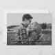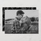 Annoncez vos nouveautés dans le style avec notre script de calligraphie blanche enregistrer les cartes de dates. L'élégant enregistrer les dates affiche votre photo horizontale fiançailles avec "Enregistrer la date" dans un script de calligraphie blanc. Personnalisez le devant de la photo enregistrez la date en ajoutant vos noms, date mariage et ville/état. La carte inverse pour afficher un motif de feuillage blanc avec un arrière - plan noir ou la couleur de votre choix.