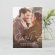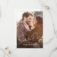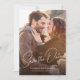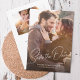 Annoncez votre date de mariage à venir avec ce simple enregistrer la date avec un élégant script d'écriture manuscrite. Le design offre deux photos : une image verticale à l'avant et une petite image horizontale à l'arrière. L'arrière-plan offre du texte personnalisé pour plus de détails mariages.