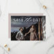 Une carte de datation moderne conçue pour accommoder votre photo de fiançailles à fond à orientation horizontale ou paysagère préférée. "Enregistrer la date" apparaît en haut de votre photo en bloc blanc et en écriture de script, avec vos noms, date mariage et emplacement du mariage en dessous. Les cartes sont inversées pour afficher d'autres informations sur la date.
