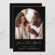 Cette simple et minimaliste carte Save the Date présente une arche photo boho au-dessus des mots "Save the Date" dans un élégant script d'écriture manuscrite blanche, suivi des noms du couple, date mariage et ville en sans serif police sur un arrière - plan noir. Ajoutez un message plus détaillé avec des informations supplémentaires sur l'inverse.