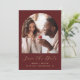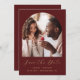 Cette simple et minimaliste carte Save the Date présente une arche photo boho au-dessus des mots "Save the Date" dans un élégant script d'écriture dorée, suivi des noms du couple, date mariage et ville en sans serif police sur un arrière - plan rouge bordeaux. Ajoutez un message plus détaillé avec des informations supplémentaires sur l'inverse, ainsi qu'un code QR qui envoie les invités à votre site Web mariage.