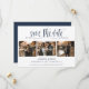 Elégant bleu marine mariage 3 photo enregistrer les cartes de date avec la calligraphie moderne. Personnalisez facilement cette carte avec vos images et les détails du mariage, y compris un site Web mariage.
