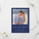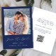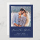 Cette simple et minimaliste carte Save the Date présente une photo carré au-dessus des mots "Save the Date" dans un élégant script d'écriture manuscrite blanche, suivie des noms du couple, de la date du mariage et de la ville en sans serif police sur un arrière - plan bleu marine. Ajoutez un message plus détaillé avec des informations supplémentaires sur l'inverse, ainsi qu'un code QR pour aider les invités à accéder à votre site Web mariage.