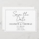 Style intemporel, faire-part inoubliable. Cette carte Simple Script Black and White Save the Date présente une typographie chic de style manuscrit sur une disposition simple et minimale, parfaite pour les couples qui veulent une façon moderne et élégante d'annoncer leur grand jour. Entièrement personnalisable avec vos noms, date et emplacement, ce design est idéal pour les mariages formels, les thèmes minimalistes ou les affaires de cravate noire. Sophistication rendue simple.