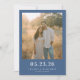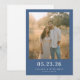 This wedding save the date features a warm, naturalistic design with a central photograph of two individuals in an outdoor setting surrounded by tall grass and trees. The color palette includes golden yellows, earthy browns, and muted greens, complemented by soft pastel clothing tones. The layout is simple yet elegant, with a navy blue border framing the image and clean serif typography for the date and location details. The mood is serene and romantic, capturing a sense of intimacy and tranquility, making it perfect for couples looking to set a nostalgic yet hopeful tone for their special day.