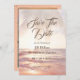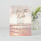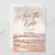 Comme les eaux magnifiques et calmantes de la plage, votre annonce Save The Date l'amènera tout à fait. Un cadre tropical de branches de palmiers au sommet, des vagues de l'océan et le coucher du soleil à l'avant avec des informations personnalisables. Une pêche, un arrière - plan corallien avec des points sépia dorés, et aussi inclure votre photo préférée.