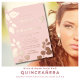 Elégante et fantaisiste Quinceañera enregistrer la carte de date avec la silhouette d'une femme faite de minuscules coeurs en or rose. Arrière - plan rose pâle personnalisable.
