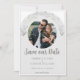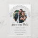 Cette Garland Photo Save the Date Annonce est livré avec un design de texte simple, un élégant garland de feuillage dans une boîte à contour moderne en attendant votre photo et vos détails mariages pour customiser contre un arrière - plan d'arche gris clair.
