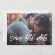 Photo moderne enregistrer la carte de date avec votre image horizontale plein fond avec une superposition de texte. Les mots "enregistrer la date" sont dans une police manuscrite de script de brosse blanche. L'arrière a tous les détails de votre mariage en noir sur un arrière - plan blanc. Un design simple mais élégant qui fait de votre photo la principale caractéristique.