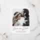 Ce mariage photo simple et chic, à l'exception de la date modèle de carte à plat, présente un design simple avec une touche chaleureuse et minimaliste et des bordures sobres. Nous offrons également une version carte postale de cette conception séparément. L'avant présente vos prénoms sous votre photo préférée et un message unique "Save our Date" en écriture manuscrite que nous avons d'abord écrit à la main puis adapté pour cette carte. Nous l'avons aussi inclus au dos. Le texte 'Save our Date' est en noir standard, et les détails de votre date et de vos paramètres régionaux ci-dessous sont un noir légèrement adouci. La couleur par défaut du texte des noms est une élégante nuance de vert foncé moyen. Vous pouvez choisir de changer la couleur du texte des noms en une autre couleur. L'élément de conception 'Save our Date' ne peut pas être modifié, mais vous pouvez choisir de le supprimer de l'arrière pour un look encore plus simple. Au verso, vous pouvez bien sûr, en plus de remplacer nos exemples d'informations par les vôtres, supprimer des champs de texte dont vous n'avez pas besoin, ou modifier le libellé, ainsi que modifier la police, la taille et la couleur. Vous pouvez par exemple changer "se marier" en "nouer le noeud", etc. ou supprimer l'exemple d'adresse du site sans le remplacer par le vôtre, ou le remplacer par un message entièrement différent. Le texte à l'arrière est un mélange de noir standard (#00000) et de noir légèrement adouci (#1c1c1c) et vous pouvez facilement changer cela si vous le souhaitez.La couleur arrière - plan par défaut sur les deux côtés est définie comme transparente, pour laisser la couleur du papier servir simplement de tonalité de base. Mais vous pouvez modifier ceci et choisir une couleur pour l'arrière - plan et changer l'apparence d'un ou des deux côtés pour convenir à votre style. Customisez ce mariage moderne élégant enregistrer la date carte plat modèle avec votre photo et votre inspiration et en faire le vôtre unique!