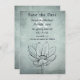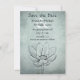 Ce simple mariage Save the Date mariage faire-part présente un dessin d'une fleur de lotus sur un arrière - plan turquoise bleu poussiéreux.