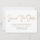 Écriture en or de cuivre minimaliste moderne enregistrer la carte de date. Cette carte élégante présente un script manuscrit en couleur or tonneau sur des détails arrière - plans et mariages blancs et des noms écrits en lettres majuscules en noir. Le dos de la carte est noir profond. Pour modifier ce modèle, cliquez sur customiser plus loin.