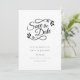 Cette carte de sauvegarde de date simple noir et blanc présente un joli script pour sauvegarder la date avec un motif de feuille, placé au-dessus de vos coordonnées dans un texte moderne élégant.
