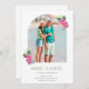 Simple photo de design de fleur tropicale enregistrer les dates pour votre mariage sur la plage. Design moderne de photo en arc avec des ornements de fleurs tropicales et un script décontracté et une police de bloc. Customisez avec votre photo, les noms, la date et l'emplacement du mariage.