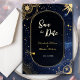 Annoncez votre mariage au charme cosmique à l'aide de cette Carte de dates Soleil Céleste et Lune. Élégant et mystérieux, le design allie harmonieusement la lumière chaude du soleil et la lumière douce de la lune, entourée d’étoiles scintillantes et d’accents célestes. Dans des tons riches d'or, de marine et de doux neutres, cette carte capture magnifiquement l'équilibre du jour et de la nuit symbolisant parfaitement votre union. Idéal pour les stargazers, les rêveurs et les âmes romantiques, c’est une façon magique de marquer le début de votre histoire d’amour céleste.
