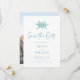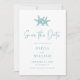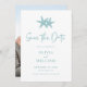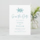 Ce mariage minimaliste de plage moderne, à l'exception de la carte date, a un arrière - plan blanc avec texte bleu aqua, deux étoiles de mer en haut, et une calligraphie manuscrite tendance, avec un modèle photo à l'arrière.