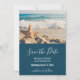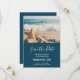 Enregistrez la carte de date avec une photo pittoresque. Une grande étoile de mer dressée sur une plage de sable. Une belle mer bleue avec des vagues de surf blanc en arrière - plan.