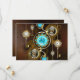 Turquoise lenses with antique watch with brass gears and golden keys on rusty, brown background. Steampunk style.